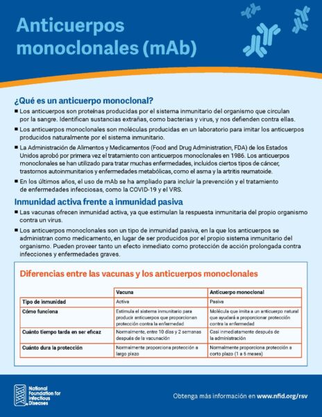 Esta hoja informativa del NFID en español proporciona información sobre los anticuerpos monoclonales (mAbs) y las diferencias entre las vacunas y los mAbs.