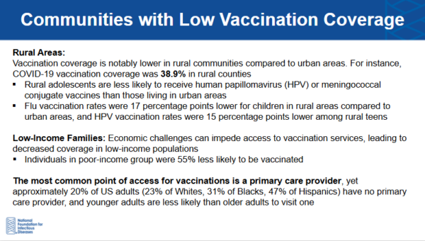 NFID brought together healthcare professionals representing medicine, nursing, and pharmacy to review the importance of vaccines to protect against severe illness and provide strategies to increase immunization rates for COVID-19, influenza (flu), respiratory syncytial virus (RSV), and pneumococcal disease.