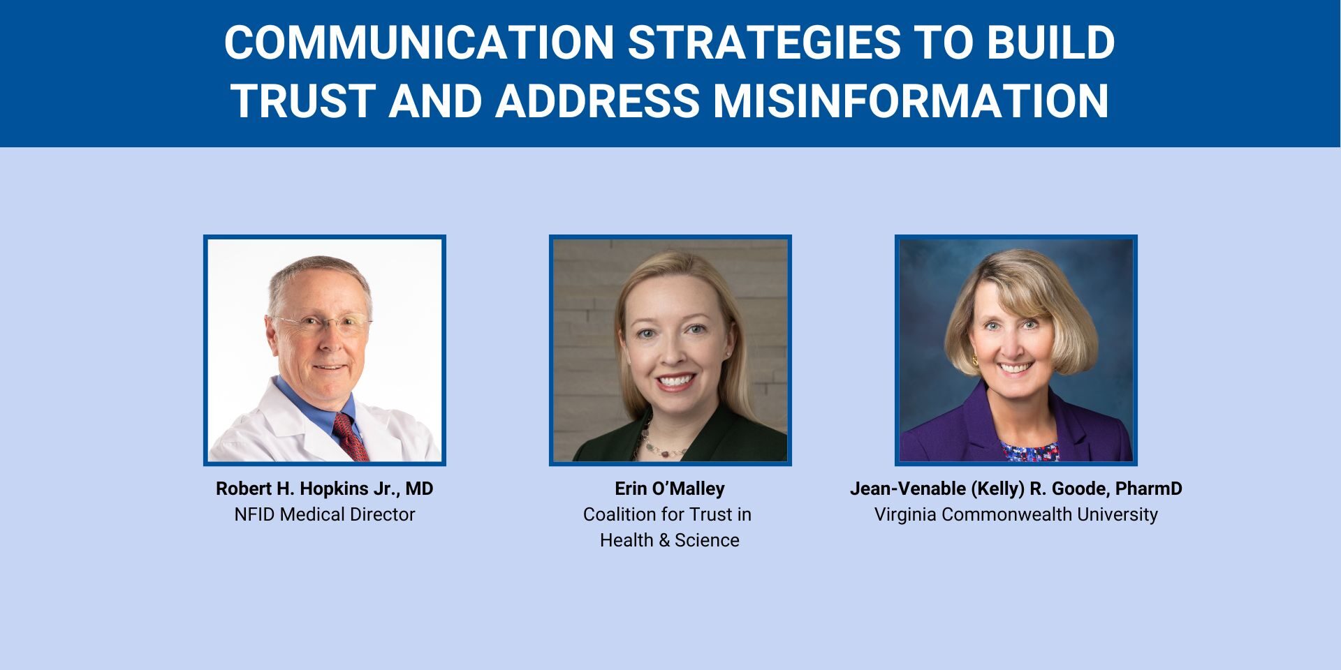 NFID Medical Director Robert (Bob) H. Hopkins, Jr., MD, moderates the discussion with Erin O’Malley, Executive Director, Coalition for Trust in Health & Science, and NFID Director Jean-Venable (Kelly) R. Goode, PharmD, Professor and Director of the Community-Based Pharmacy Residency Program at Virginia Commonwealth University.
