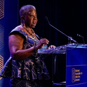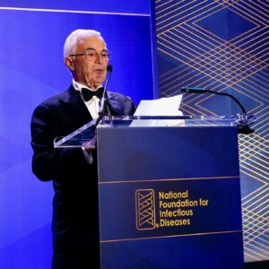 In recognition of her groundbreaking work as a visionary physician-scientist and humanitarian whose contributions have helped change the course of TB and HIV/AIDS, NFID honored Anne E. Goldfeld, MD. Her fusion of scientific discovery, clinical care, and humanitarian action has driven breakthroughs in treatment and expanded access to lifesaving care. A visionary leader at the intersection of science and service, in parallel with her work as a physician-scientist at Harvard Medical School, Goldfeld co-founded transformative treatment and research programs in Cambodia for TB, drug-resistant TB, and HIV—and later for drug-resistant TB in Ethiopia—bringing care to some of the world’s most underserved populations. Applying her scientific expertise to TB and HIV, her work has provided a new understanding behind the immune response to TB and TB/HIV co-infection and changed global treatment guidelines for HIV/TB treatment, which is estimated to have saved more than 150,000 lives annually over the last 14 years.